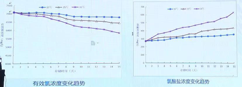 把15℃、25℃、35℃的結(jié)果挑出來,發(fā)現(xiàn)35℃儲存10天的時候有效氯衰減了近13%,同時氯酸鹽含量增加了近80%。