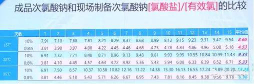成品次氯酸鈉和現(xiàn)場制備次氯酸鈉氯酸鹽有效氯比值在不同溫度下的比較(15℃、25℃、35℃)結(jié)果看出,雖然絕對值不一樣,但是比率沒有太大差別,所以不管成品次氯酸鈉還是現(xiàn)場制備次氯酸鈉都會存在氯酸鹽和有效氯的比值隨著儲存時間增加的問題。